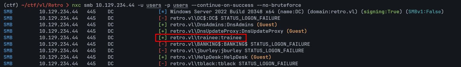 This confirmed a Windows DC (domain retro.vl). We added its IP to /etc/hosts